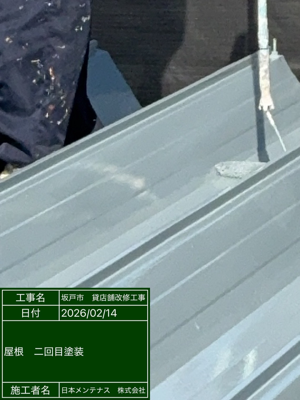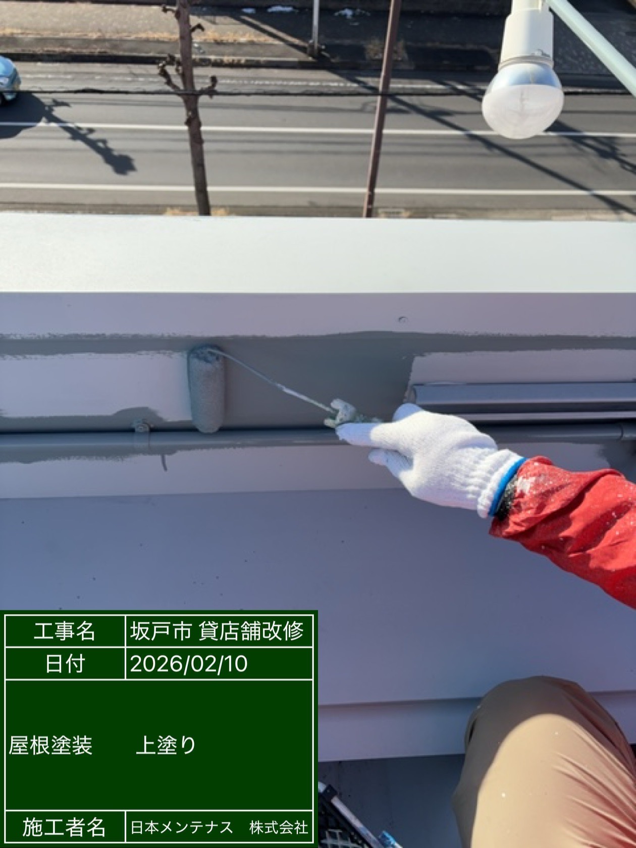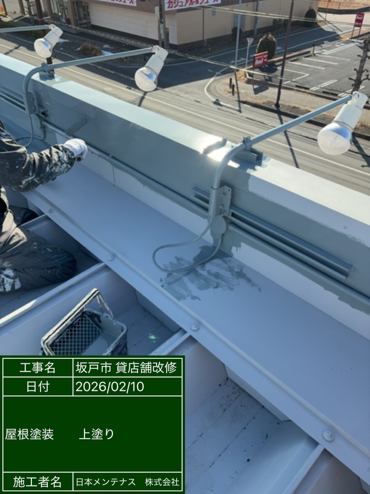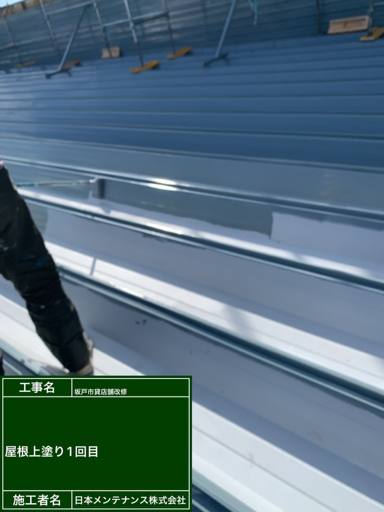 坂戸市の貸店舗で折板屋根上塗り1回目を行いました!