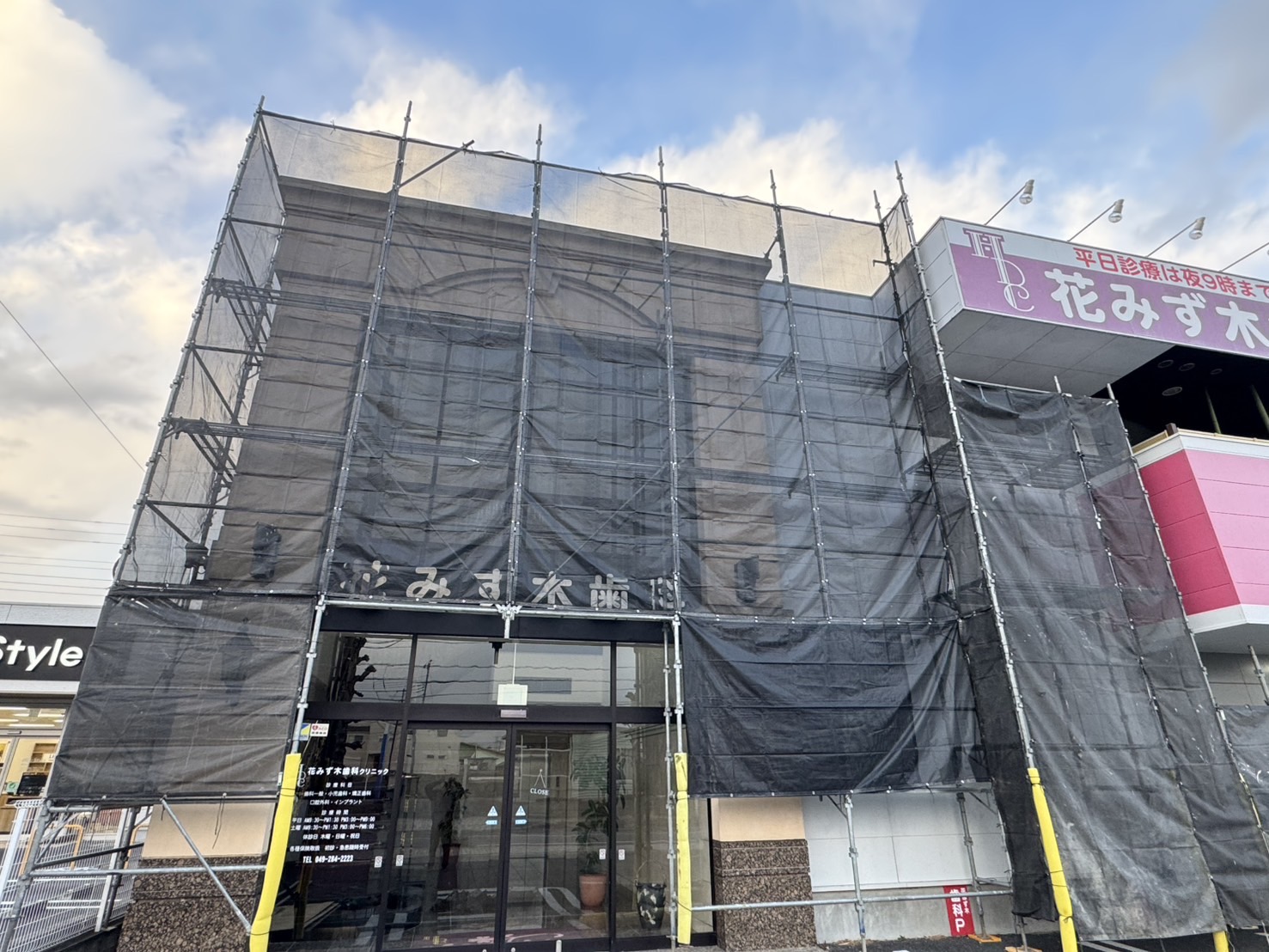 坂戸市の貸店舗で仮設足場の組み立てを行いました!